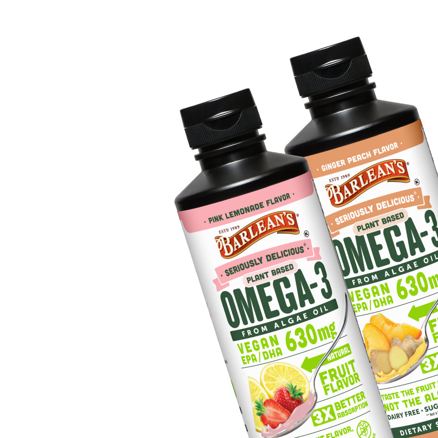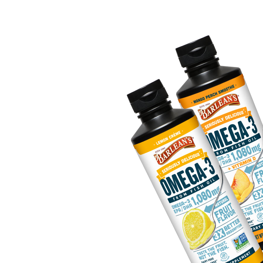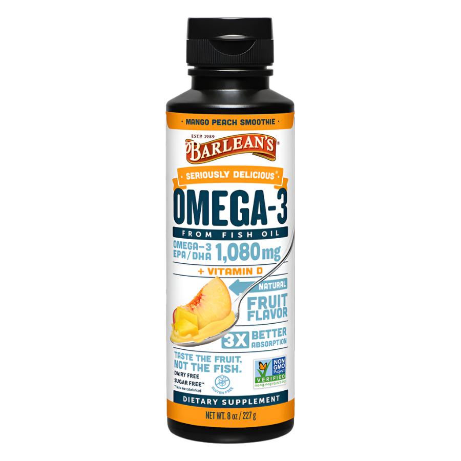 Barlean’s Mango Peach Omega-3 + D3 bottle on white background